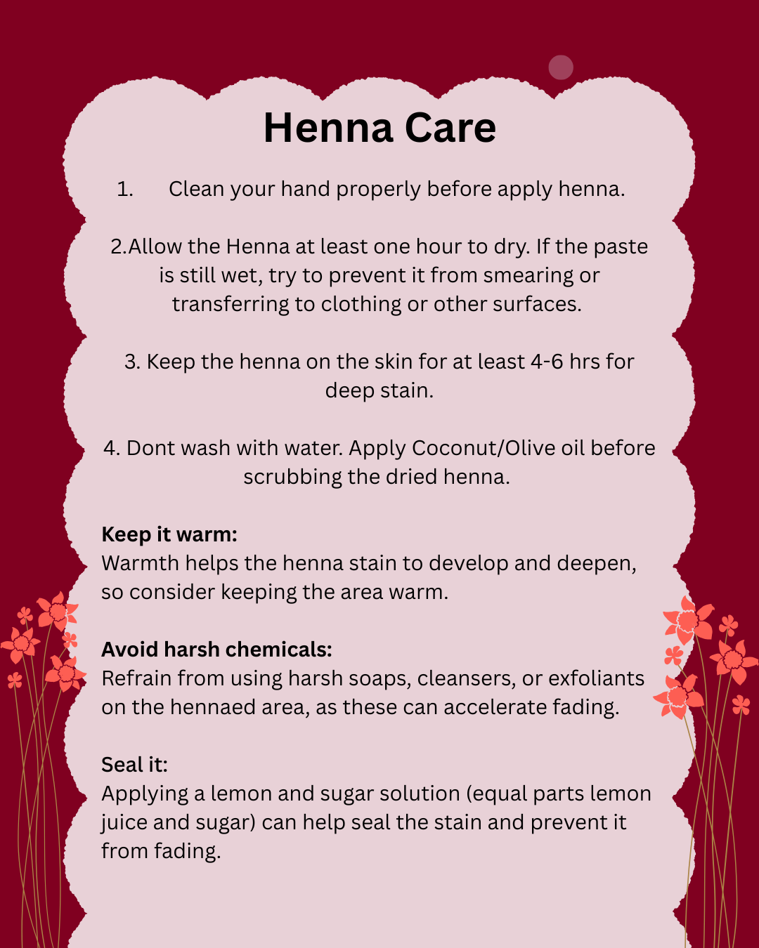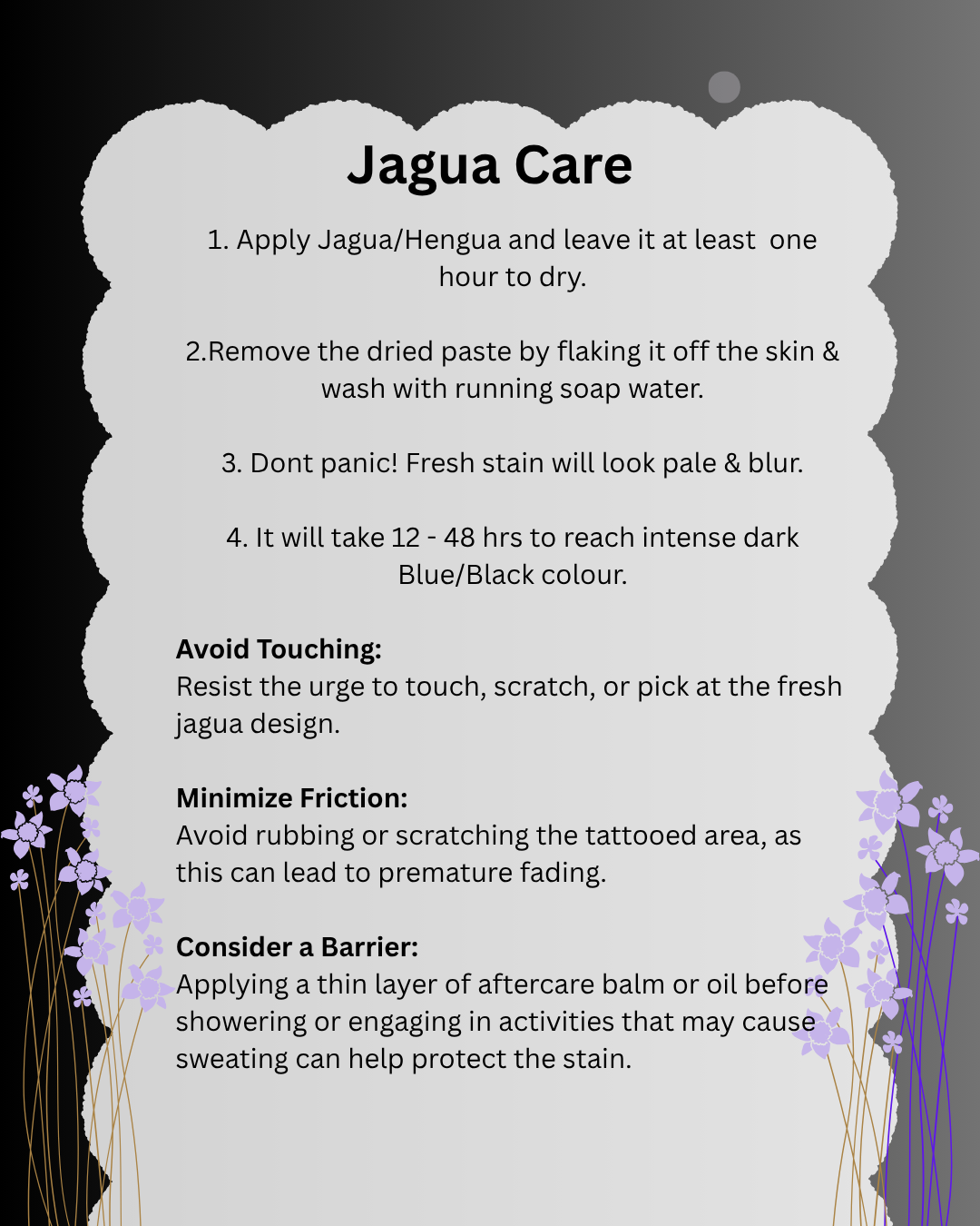 This page provides clear, step-by-step instructions to help you get the best results from your Henna or Jagua designs. From how to prepare your skin before application to how to care for your stain after removal, follow these tips to ensure deeper color, longer-lasting results, and a beautiful finish every time.
